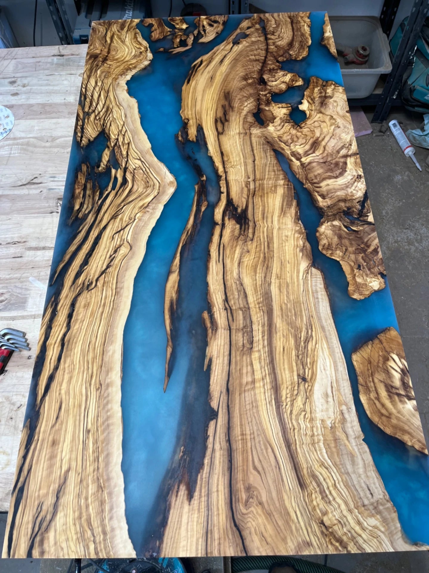 Dopřejte si stůl, který nikdo jiný nemá. Proces zrání dřeva a postupné odlévání modré „řeky“ neuspěcháme – váš originál k vám dorazí během 6 až 8 týdnů.