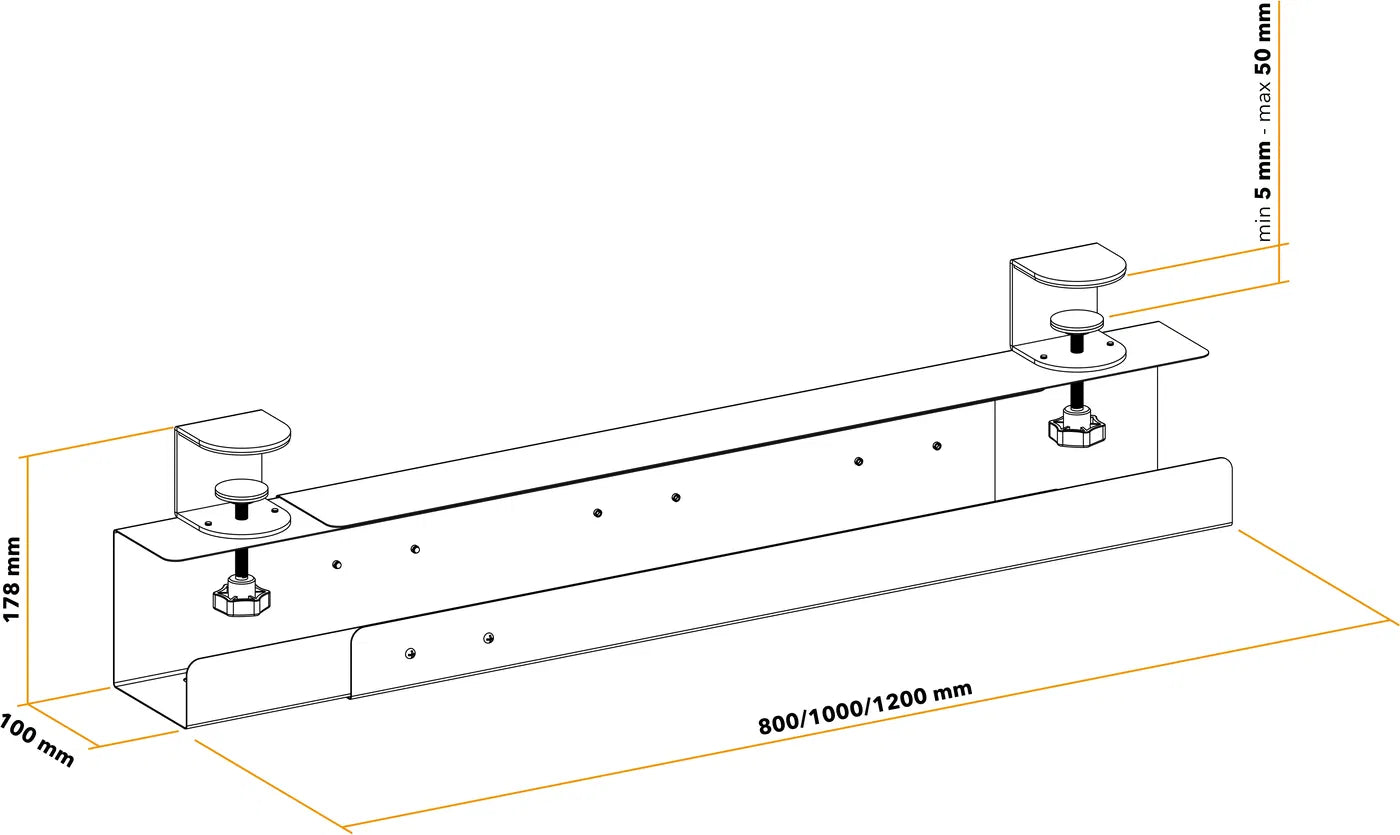 Organizér kabelů - materiál ocel a ABS, upínací mechanismus bez vrtání, výřezy pro odvod tepla, nastavitelná délka 800, 1000 či 1200 mm, nosnost 5 kg, kompatibilní s polohovatelnými stoly Orkworio